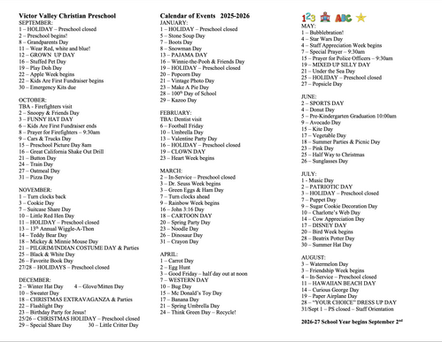 VVCS PRESCHOOL: CALENDAR OF EVENTS
